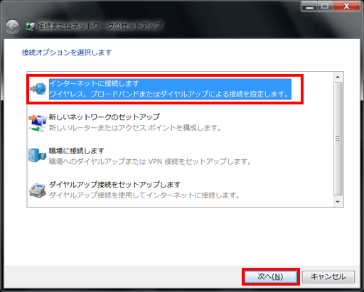 4. 【インターネットに接続します】を選択し、【次へ】をクリックしてください。