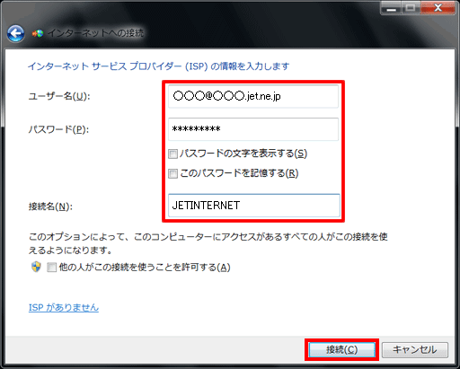 6. パスワードを保存しない設定にした場合、ダイアログボックスが表示されますので、【パスワード】を入力後、【接続】をクリックしてください。
