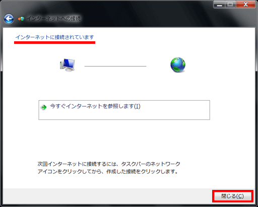 8. 「インターネットに接続されています」と表示されましたら、【閉じる】をクリックしてください。
