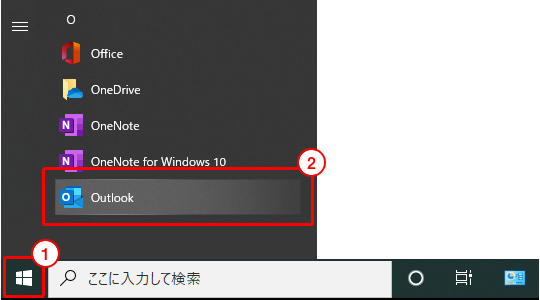 1. 「スタートメニュー」をクリックします。 2. 「Outlook」を起動します。