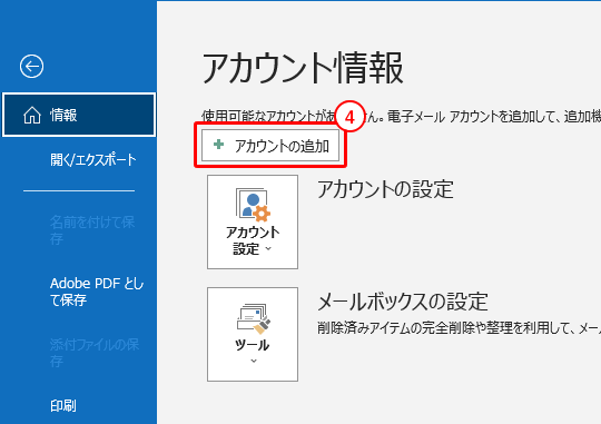 4. 「情報」→「アカウントの追加」をクリックします。