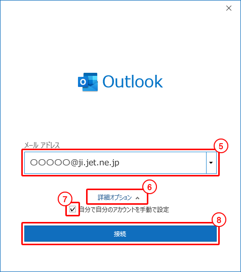 5. 「設定するメールアドレス」を入力します。 6. 「詳細オプション」をクリックします。 7. 「自分で自分のアカウントを手動で設定」にチェックします。 8. 「接続」をクリックします。