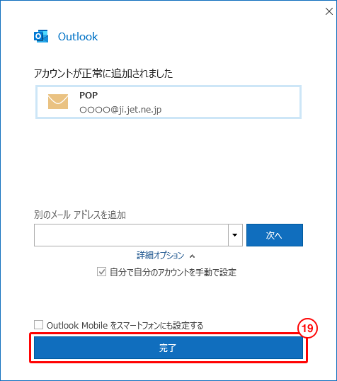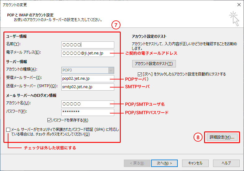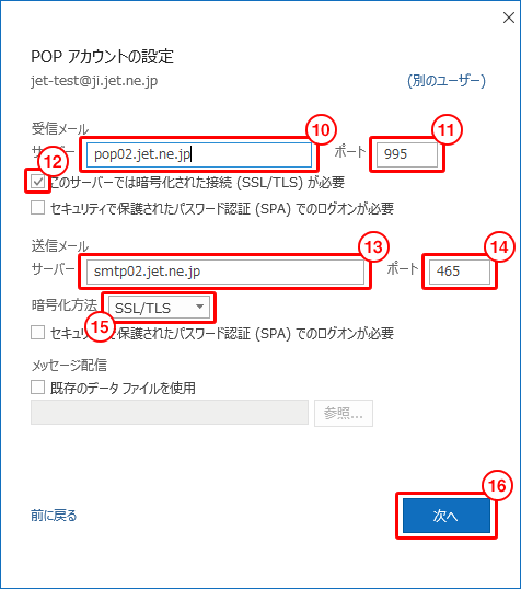 10. 「受信メールサーバー」の欄に、「pop02.jet.ne.jp」と入力します。 11. 「ポート」の欄に、「995」と入力します。 12. 「このサーバーでは暗号化された接続(SSL/TLS)が必要」に、チェックします。 13. 「送信メールサーバー」の欄に、「smtp02.jet.ne.jp」と入力します。 14. 「ポート」の欄に、「465」と入力します。 15. 「暗号化方法」を、「SSL/TLS」にします。 16. 「次へ」をクリックします。