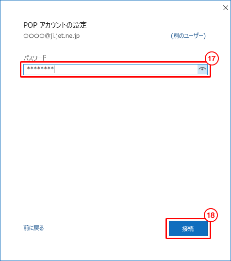 17. 会員証に記載されている「POP/SMTPパスワード」を入力します。 18. 「接続」をクリックします。