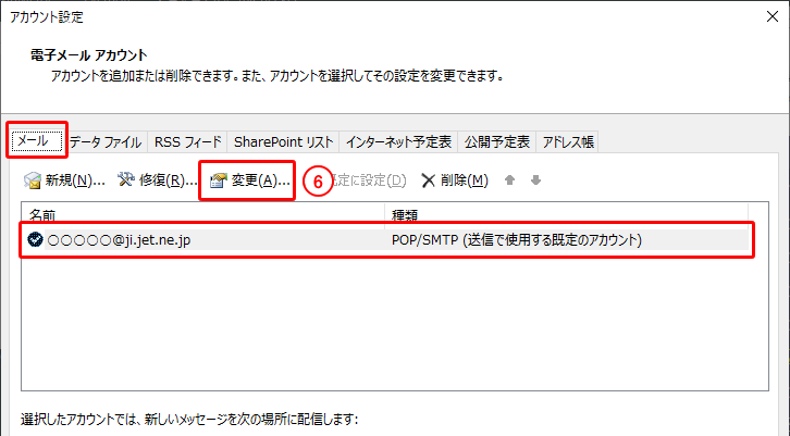 6.「メール」のタブで@ji.jet.ne.jpのアカウントを選択し、「変更」をクリックします。