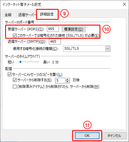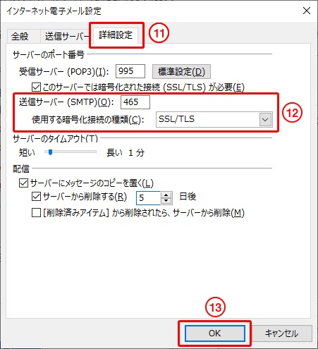 10.受信サーバーのポート番号を「995」にし、「このサーバーでは暗号化された接続(SSL/TLS)が必要」にチェックを入れます。