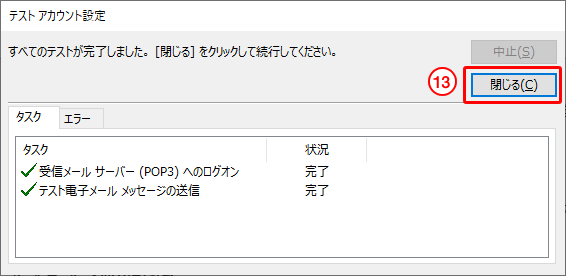 13.設定した内容が問題なければ、「すべてのテストが完了しました。」という画面が表示されます。「閉じる」をクリックします。