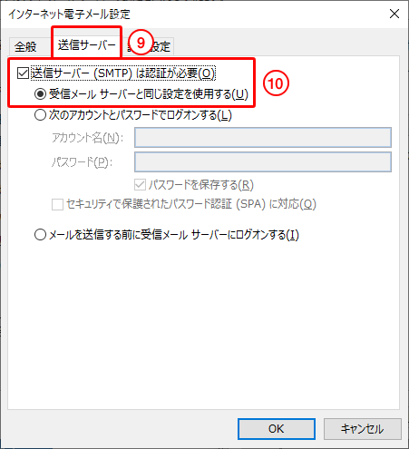 10.「送信サーバー(SMTP)は認証が必要」にチェックをいれ、「受信メールサーバーと同じ設定を使用する」を選択します。