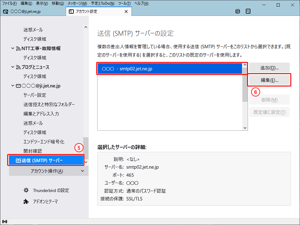 6. 送信(SMTP)サーバーの設定画面が表示されるので、smtp02.jet.ne.jpを選択し、「編集」ボタンをクリックします。