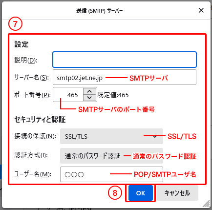 7. 送信(SMTP)サーバーの設定画面が表示されるので、サーバー名、ポート番号などを確認します。