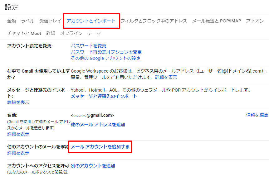 3.設定の画面から「アカウントとインポート」をクリックし、「他のアカウントのメールを確認」の項目から「メールアカウントを追加する」をクリックします。