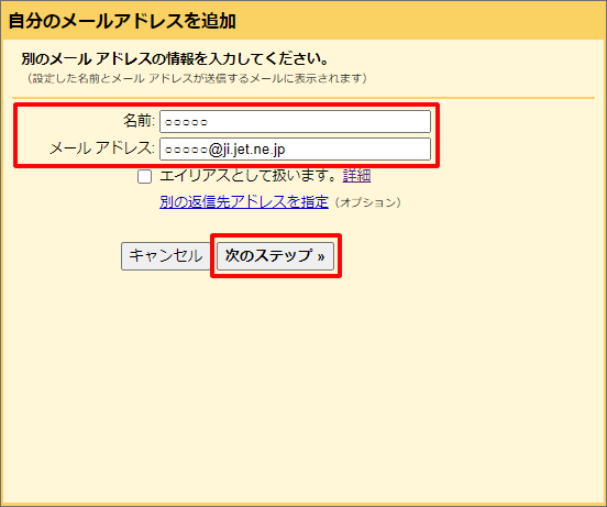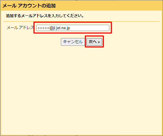 4.@ji.jet.ne.jpのメールアドレスを入力し、「次へ」をクリックします。