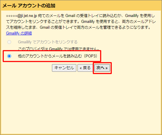 5.「他のアカウントからメールを読み込む(POP3)」を選択し、「次へ」をクリックします。