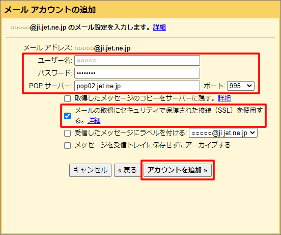 Gmail上で、@ji.jet.ne.jpのメールの送受信が可能です。