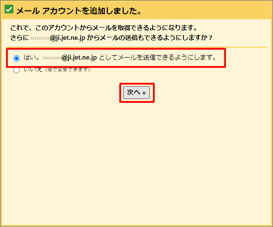 引き続き、送信の設定を行います。「はい。」を選択して「次へ」をクリックします。