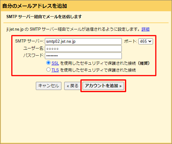 6.メール設定について、以下の通り入力した後、「アカウントを追加」をクリックします。