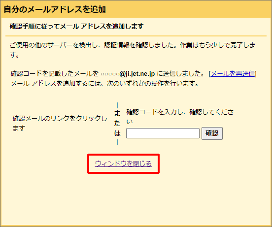 9.「確認手順に従ってメールアドレスを追加します」という画面になったら、一旦「ウィンドウを閉じる」で閉じ、Gmailのメイン画面に戻ります。