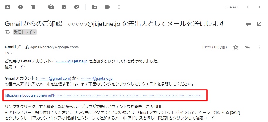 10.受信トレイを開くと、「Gmailからのご確認」というメールが入っているので、そのメールの本文に記載されているURLをクリックします。(GmailのPOP受信には数十分程度かかる場合がありますので、他のメールソフトで受信可能な場合はそちらを確認いただくことをおすすめいたします。)