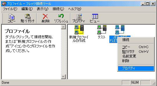 7.新しく作成された[JET-NET FLET'S ADSL]のアイコンの上で右クリックし、表示されたメニューから「プロパティ」を選択します。