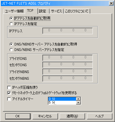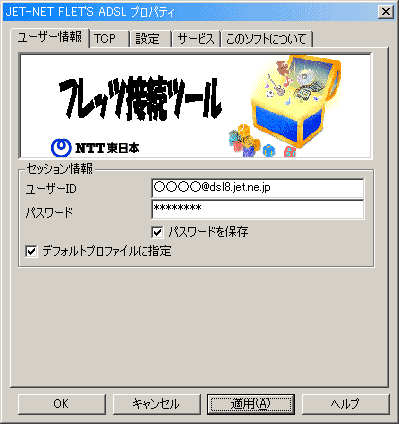 8.表示された[JET-NET FLET'S ADSL]プロパティの画面の[ユーザー情報]タブが以下ように設定されているかどうか確認します。