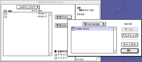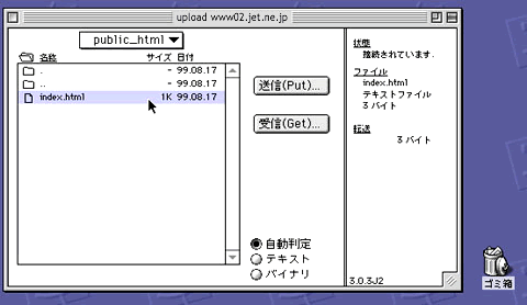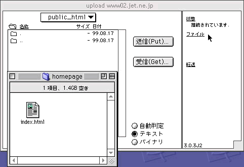 ※通常は自動判定で送信出来ますが、HTMLなどのテキストファイルをアップロードする時は「テキスト」をGIFやJPEGなどの画像ファイルをアップロードするときは「バイナリ」を選択するようにすると転送時にファイルが壊れるなどの失敗がありません。
