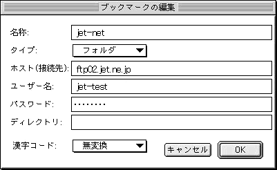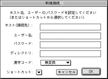 fetchはMacでは一番有名なFTPクライアントです。Fetchはシェアウェアですが、試用でも制限なく使う事が出来ます。気に入って使用を継続したい場合はユーザ登録をして下さい。Fetchの入手と詳細はこちらをどうぞ。「WWWサーバについて」もお読み下さい。