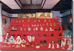 斎理の大広間で、年に一度の長い夢から目覚めるお雛さま。今の人形とは面立ちが違いますので、どうぞお会いください。