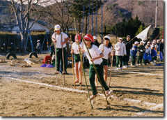 7種目全競技に竹馬を使って行われるこの運動会では、 サッカーやかけっこ、五百メートルを走るクロスカントリーなどが行われ、どの児童も巧みに竹馬をコントロールし、ゴールを目指します。
