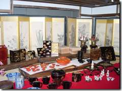 正月道具の手入れをかねて、蒔絵の什器の数々をご覧にいれます。蒔絵とは、漆の上に金銀を乗せて、いろいろなデザインを描いたもの。昔は一家にそんなに沢山のお椀やお膳がそろっていることはありませんでした。斎理は同じ模様のものが、二十、四十、八十といった単位で揃えられています。ずらりと並ぶと壮観です。 また、斎理に滞在したらしい川端玉章などの金屏風もご覧いただけます。