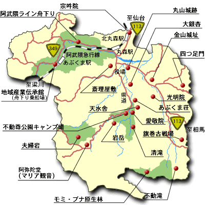 丸森町は、阿武隈山地と阿武隈川に抱かれ、自然に恵まれており、この歴史と自然が観光に活かされています。そして、昭和63年11月には町全体の15.7%に当たる4,303haが阿武隈渓谷として県立自然公園に指定されています。また、町内には史跡文化財も多く抱え、代表的なものとして、「斎理屋敷」「宗吽院拝殿」「不動尊仁王門」「台町古墳群」等がある。